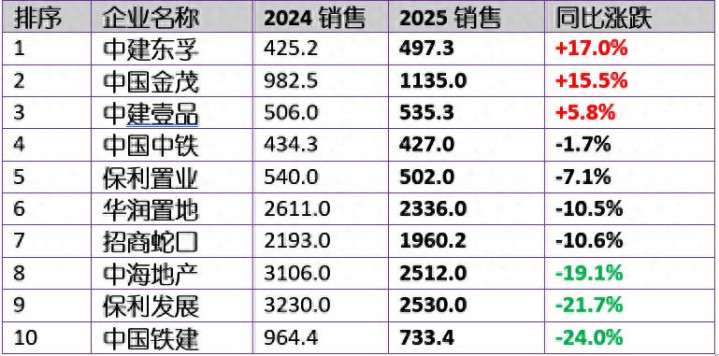 虽然行业进入央国企主导的格局4年了,但地产10强央企的格局并没有乾坤已定,仅仅以2025年业绩表现看,央企10强之内也分化颇大。