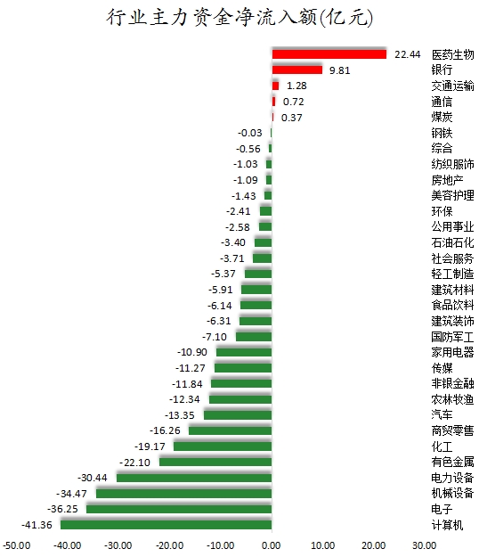从行业来看,申万所属的31个一级行业,今日有5个行业主力资金呈现净流入,其中,医药生物行业主力资金净流入最多,净流入金额为22.44亿元;行业主力资金净流入居前的还有银行、交通运输等,净流入金额分别为9.81亿元、1.28亿元。26个行业主力资金呈现净流出,其中,计算机行业主力资金净流出最多,净流出金额为41.36亿元;行业主力资金净流出靠前的还有电子、机械设备、电力设备、有色金属、化工、商贸零售等,净流出金额分别为36.25亿元、34.47亿元、30.44亿元、22.1亿元、19.17亿元、16.26亿元。