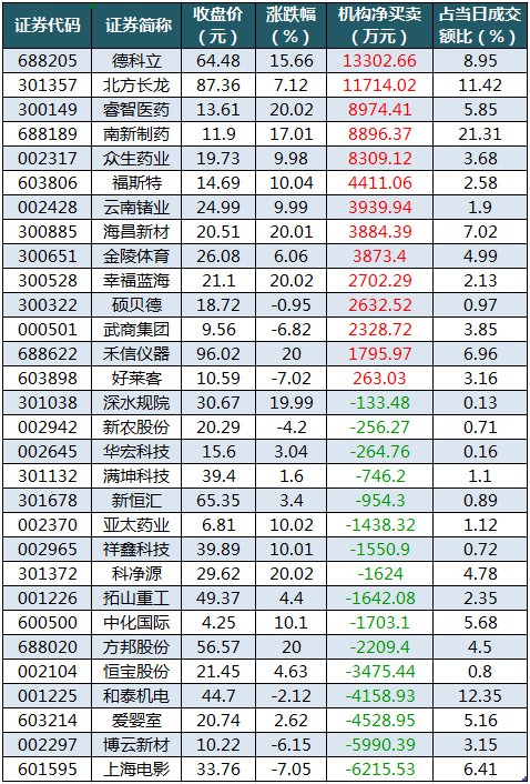 盘后龙虎榜数据显示,今日机构席位资金合计净买入约4.01亿元。其中,净买入的个股14只,净卖出的个股16只。机构净买入最多的股票是德科立,净买入金额约1.33亿元;机构净买入居前的还有北方长龙、睿智医药、南新制药等股。机构净卖出最多的股票是上海电影,净卖出金额约6215.53万元;机构净卖出居前的还有博云新材、爱婴室、和泰机电等股。