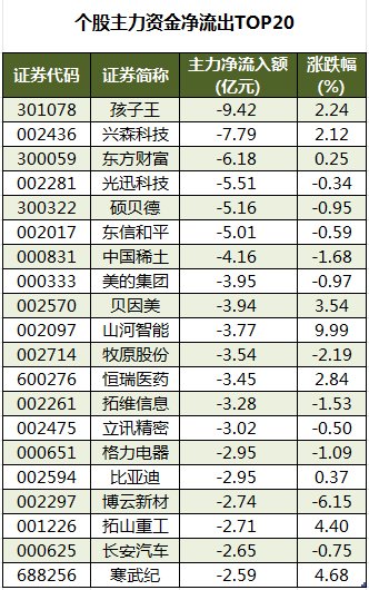 今日有3156只个股被主力资金净卖出,其中,87股被主力资金净卖出超1亿元。主力资金净流出最多的个股是孩子王,净流出金额为9.42亿元;主力资金净流出居前的个股还有兴森科技、东方财富、光迅科技、硕贝德、东信和平等,净流出金额分别为7.79亿元、6.18亿元、5.51亿元、5.16亿元、5.01亿元。
