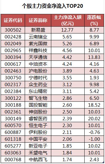 个股来看,今日有1989只个股获主力资金净流入,其中,43股获主力资金净流入超1亿元。新易盛主力资金净流入最多,净流入金额为12.77亿元;主力资金净流入居前的个股还有云南锗业、紫光国微、祥鑫科技、天孚通信、中油资本等,净流入金额分别为5.65亿元、5.26亿元、4.56亿元、4.42亿元、4.24亿元。