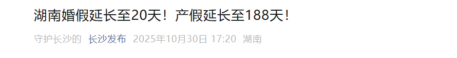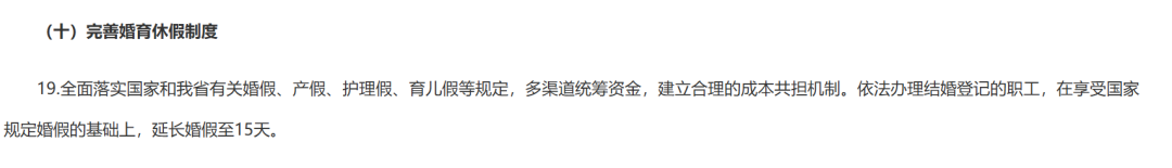 今年7月14日,湖北印发《关于加快完善生育支持政策体系更加务实有效建设生育友好型社会的若干措施》,提到依法办理结婚登记的职工,在享受国家规定婚假的基础上,延长婚假至15天。