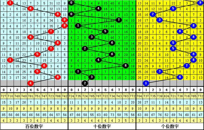 百位上期开出号码8,为偶数,偶数号最近出现次数较少,目前开出1期,逐渐回补,本期防止再次出现,关注4。