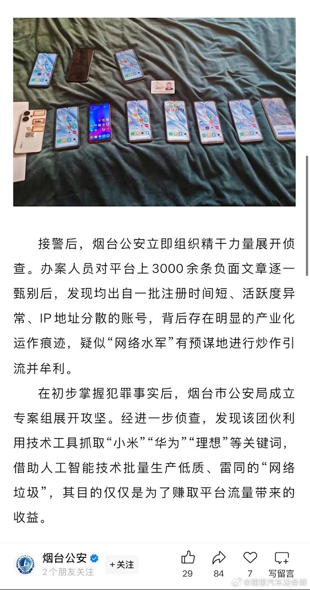 而烟台公安在通报中指出,今年7月份以来,小米公司、华为鸿蒙智行、理想汽车等企业先后报警称:某平台集中涌现大量针对其汽车品牌的负面文章。