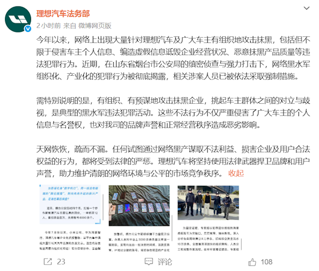 今年以来,网络上出现大量针对理想汽车及广大车主有组织地攻击抹黑,包括但不限于侵害车主个人信息、编造虚假信息诋毁企业经营状况、恶意抹黑产品质量等违法犯罪行为。