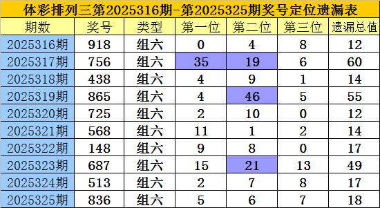开奖回顾:排列三第2025325期奖号为:836,各位号码遗漏值分别为5、6、7,遗漏总值为18。