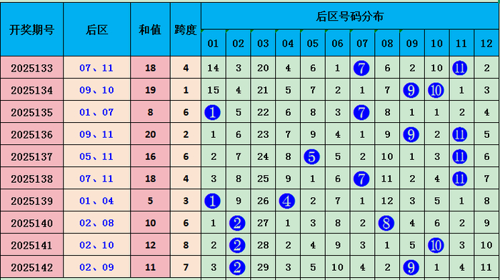 上期后区开出号码02 09,和值11,近十期和值18 19 8 20 16 18 5 10 12 11,和值波动范围较大,本期预测和值会下降,重点关注号码:03 06,和值9 。