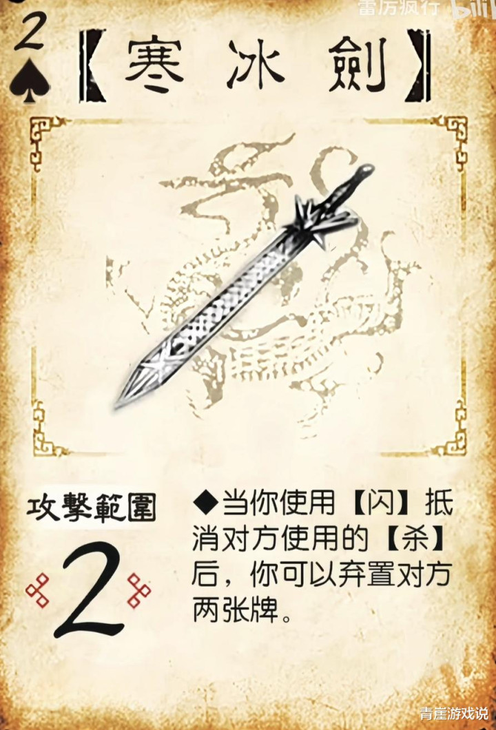 寒冰剑的防御效果是出闪后弃置对方两张牌,说是防御能力,其实更偏向进攻拆迁。如果手里有闪,那么寒冰剑无疑是无解的防御牌,如果对方更是张角、甄姬这种和闪高度绑定的武将,那威慑力简直是无敌!