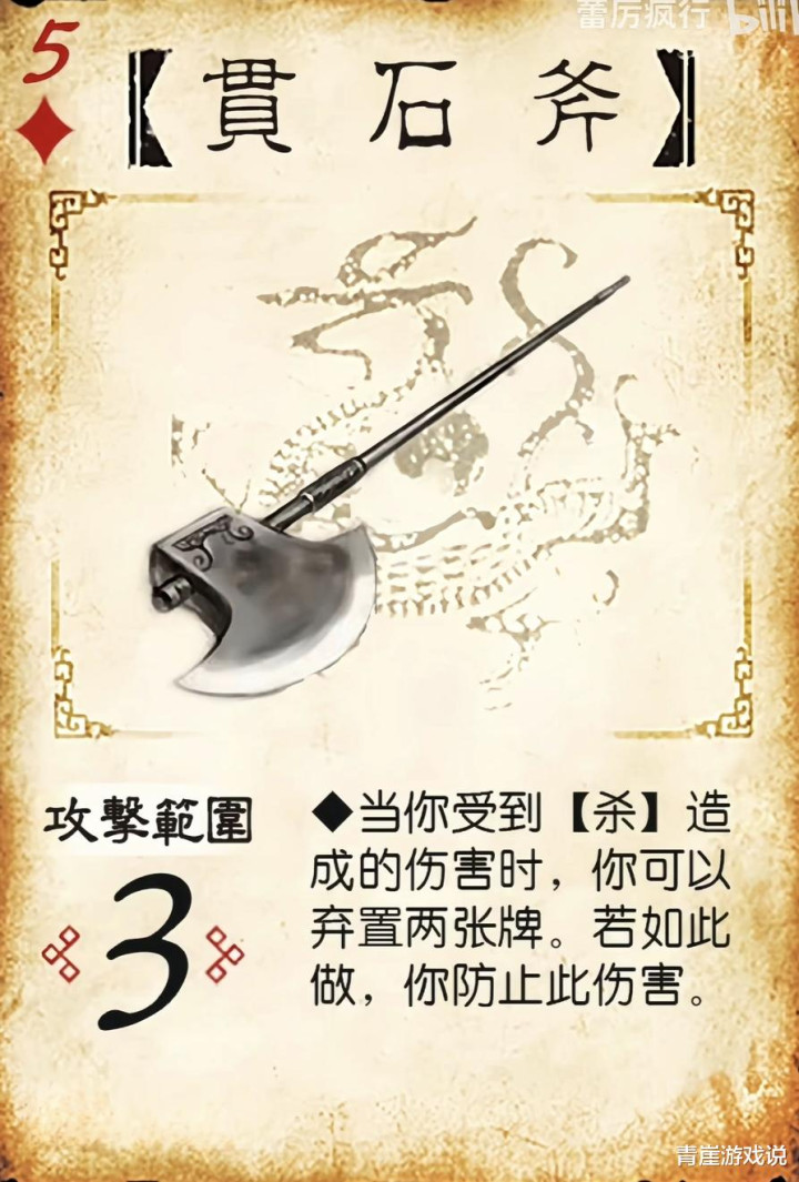 贯石斧的防御效果是弃置两张牌,防止受到的伤害。贯石斧的防御效果还不错,用两张牌防止一次伤害,可以拿废牌来防御。相信大家都有抽到闪电、借刀杀人的时刻,那此时用来扔掉换取防御再合适不过咯。