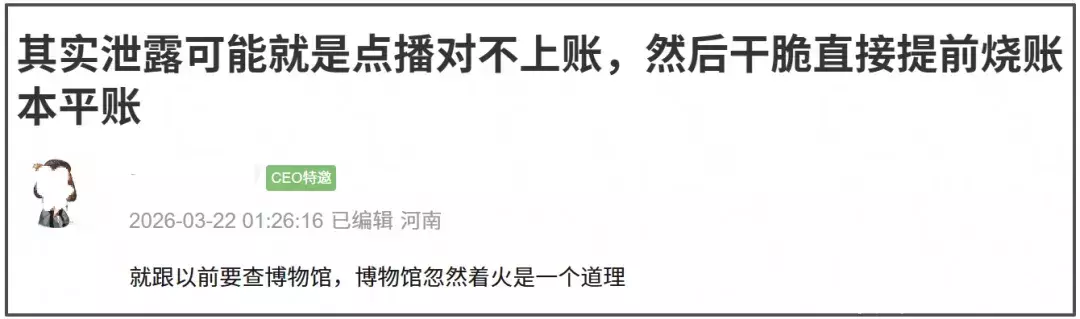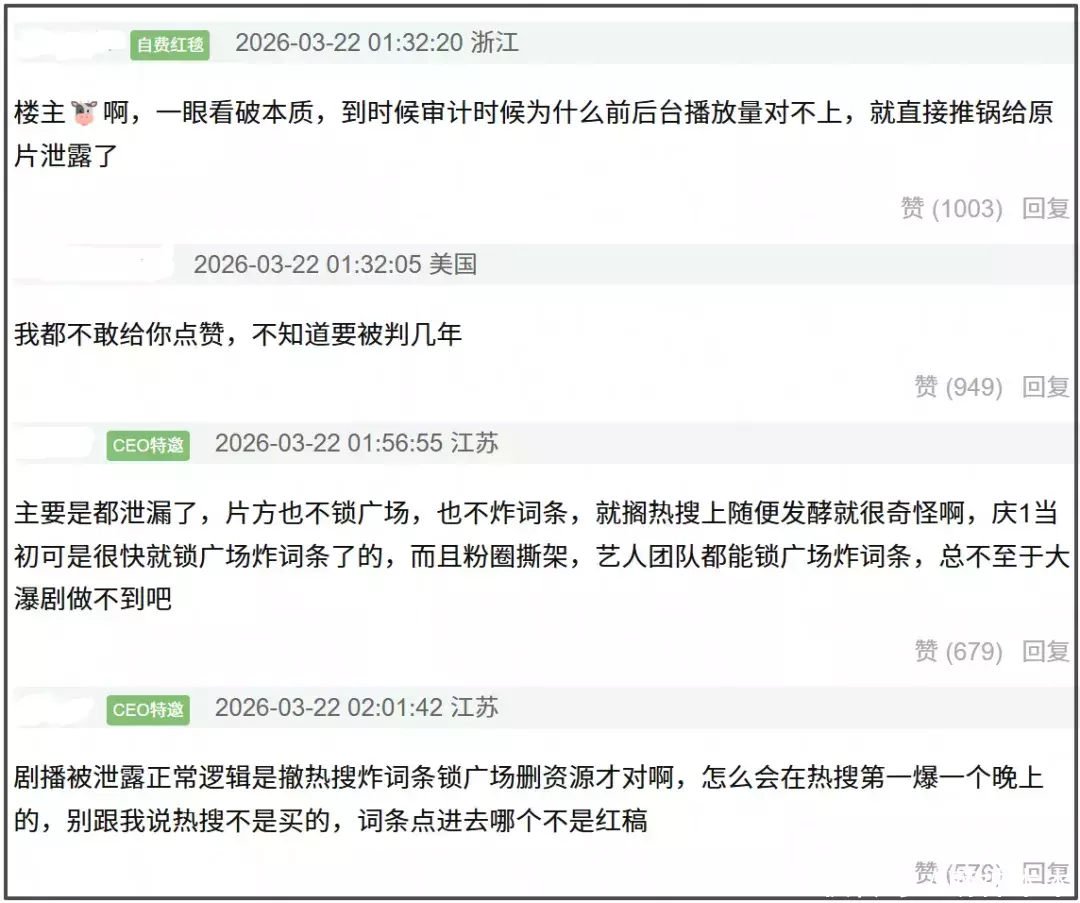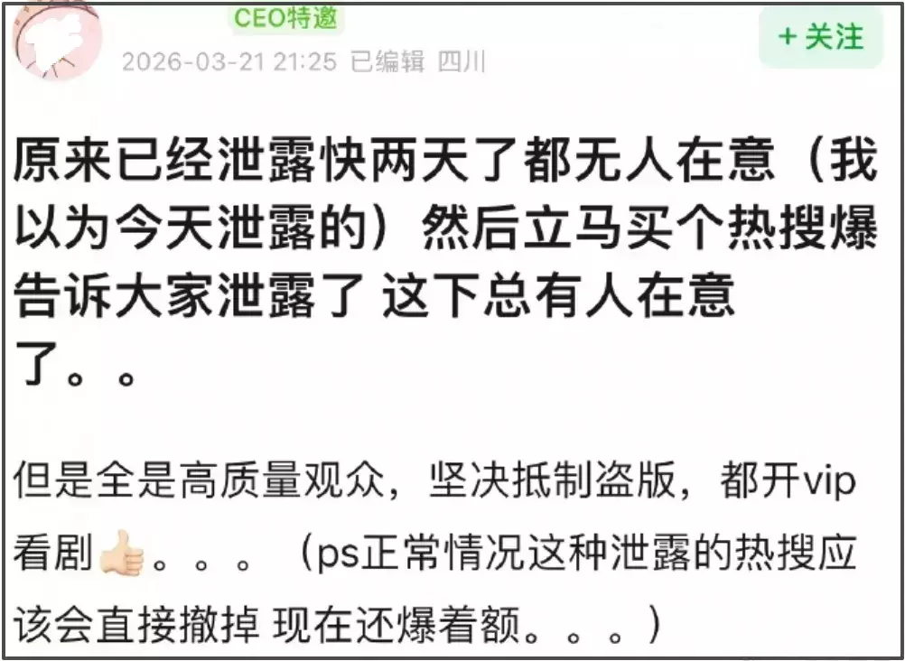 透过现象看本质,《逐玉》在超点前期来了一场声势浩大的资源泄露事件,这是不是在为后续的超前点播对不上账做准备?要不然怎么解释片方不锁广场、不炸词条、任由热搜发酵的行为。