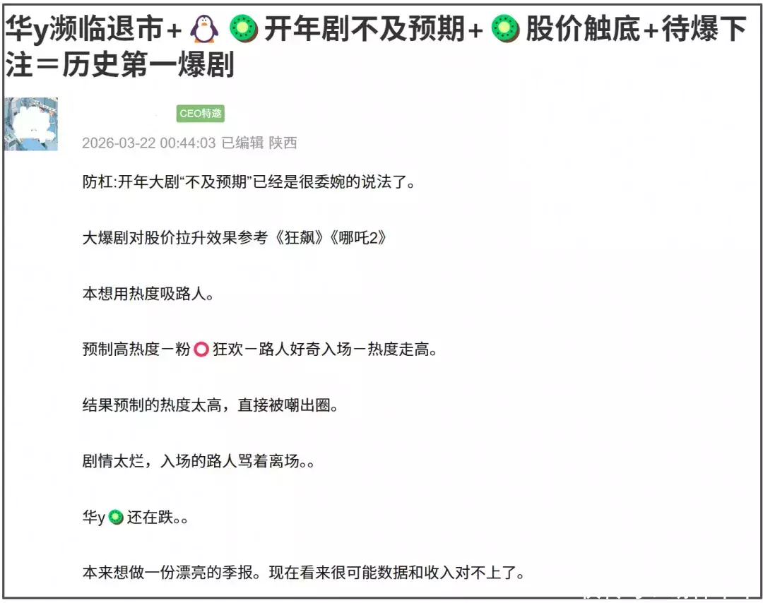 如今的《逐玉》成为强捧遭反噬的经典例子,鹅和桃两个平台都计划用开局的高热度吸引路人进场,进而令热度持续走高。可是,预制的热度太高,剧情又留不住观众,《逐玉》直接被嘲出圈。现在,华谊兄弟濒临退市、桃厂股价触底,资本真是赔了夫人又折兵啊。