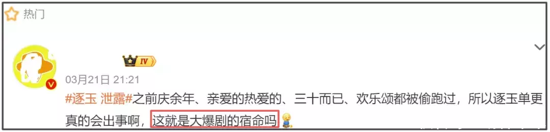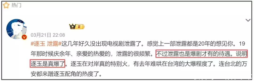 更细思极恐的是,在“《逐玉》泄露”等相关话题的热搜广场上,热门内容不是剧粉的维权,而是营销号的“高呼”,多个营销号发表类似“泄露也是爆剧才有的待遇”、“这就是大爆剧的宿命”等文字,并且把《逐玉》和《庆余年》、《亲爱的热爱的》等爆剧对标。总而言之,剧集资源泄不泄露不重要,剧集爆不爆才重要。