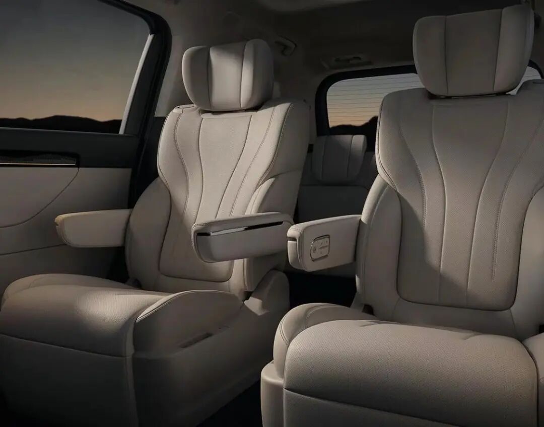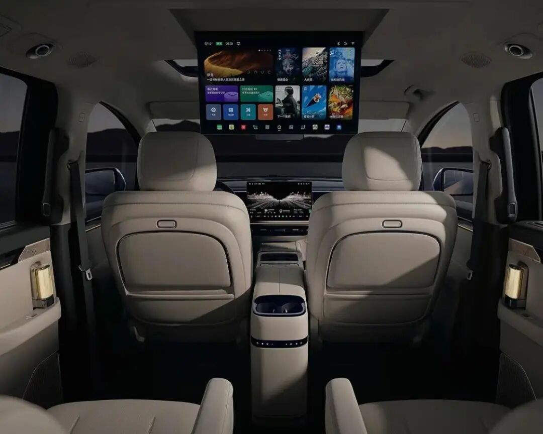 内饰部分,新车全系标配10.25英寸仪表屏和15.6英寸中控屏,并提供电子怀档杆。座椅布局方面,新车车内采用2+2+3的七座布局。其中,二排提供两个独立的豪华座椅,带有腿托、加热等功能,并提供17.3英寸后排屏幕、随行小桌板以及三温冰箱。